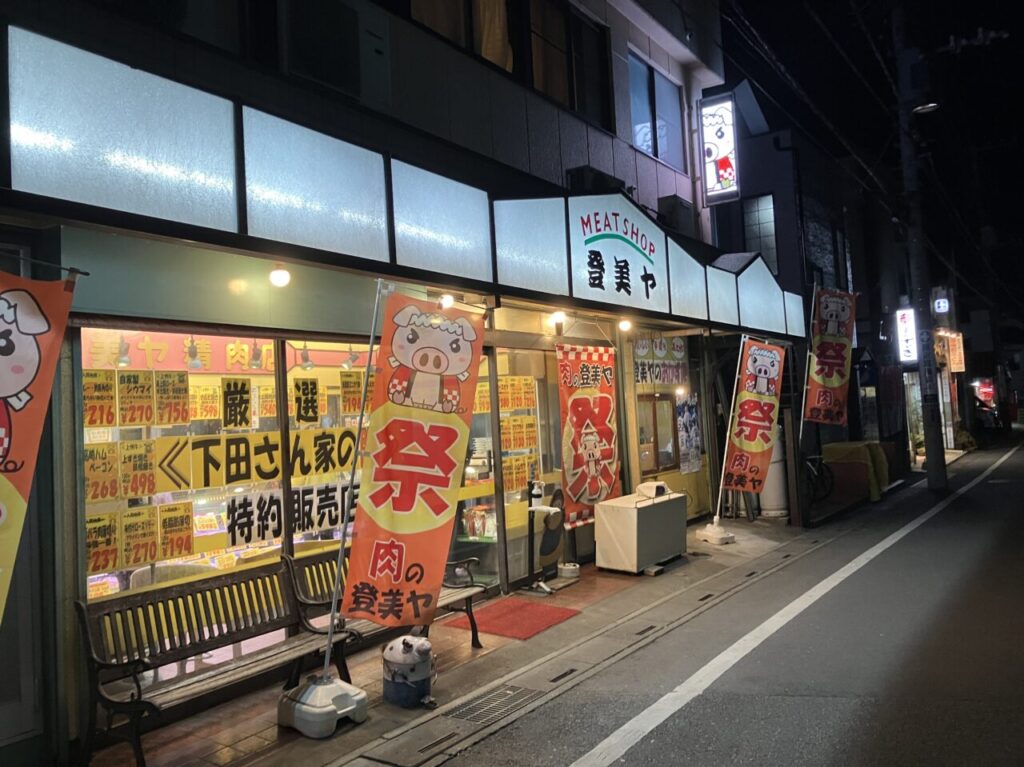 入間市東藤沢の商店街に店を構える「登美ヤ精肉店」。外観は、いかにも昔ながらのお肉屋さんといった佇まいで、どこか懐かしさを感じさせます。訪問した際には、すでに数名のお客さんが順番を待っており、地域に根付いた人気店であることがうかがえました。